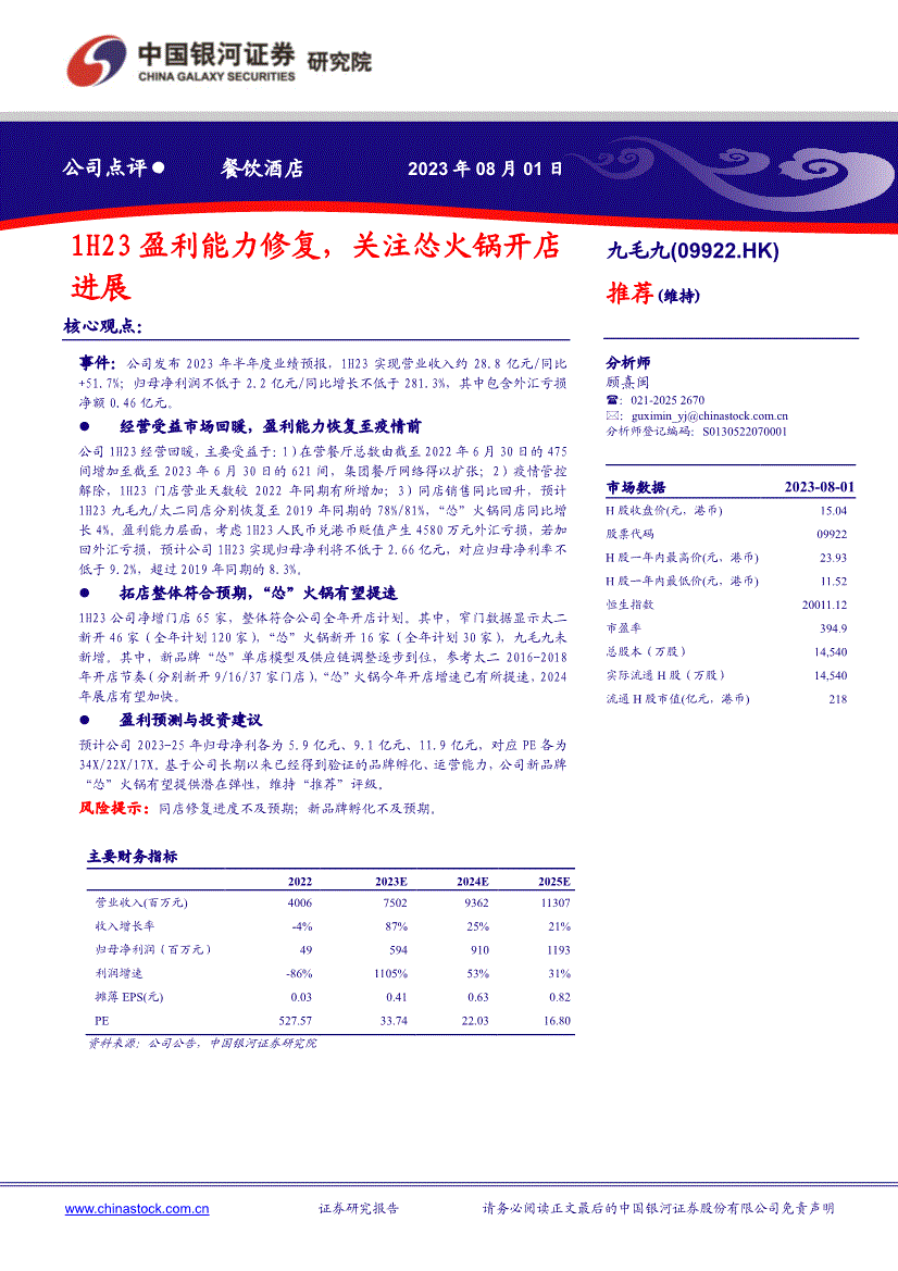 证券研究报告请务必阅读正文最后的中国银河证券股份有限公司免责声明公司点评● 餐饮酒店 2023年08月01日公司深度报告模板1H23盈利能力修复,关注怂火锅开店进展九毛九 推荐(维持) 核心观点: 事件:公司发布2023年半年度业绩预报,1H23实现营业收入约28.8亿元/同比+51.7%;归母净利润不低于2.2亿元/同比增长不低于281.3%,其中包含外汇亏损净额0.46亿元。